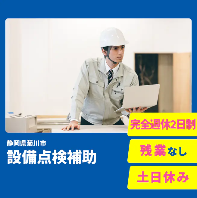 給与詳細 月収例 240,000円 日給例 12,000円 勤務地 静岡県菊川市 仕事内容 ・ユーティリティー設備点検補助(電気・水道・LPG・排水処理場・コンプレッサー等)