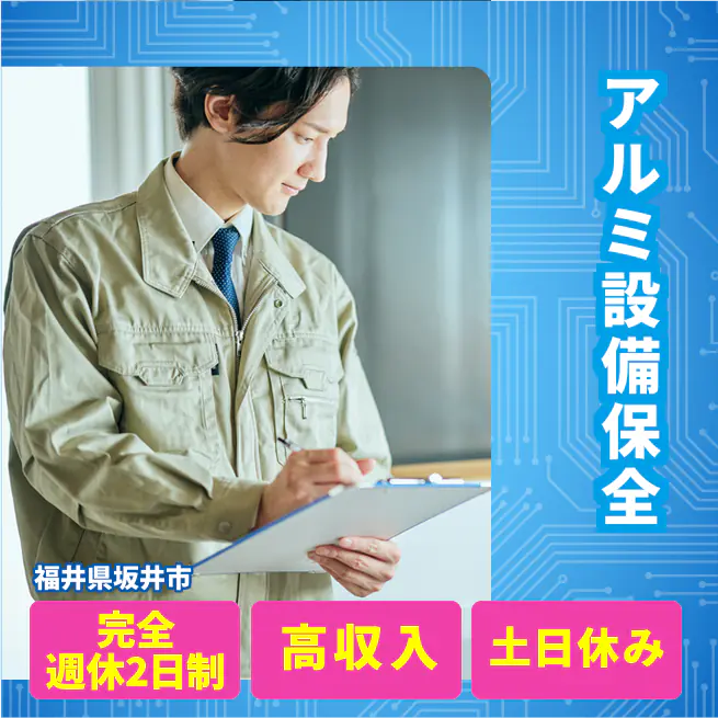 給与詳細 月収例 232,000円 日給例 11,600円 勤務地 福井県坂井市 仕事内容 綜合アルミメーカーにて設備メンテナンス(保守・整備)