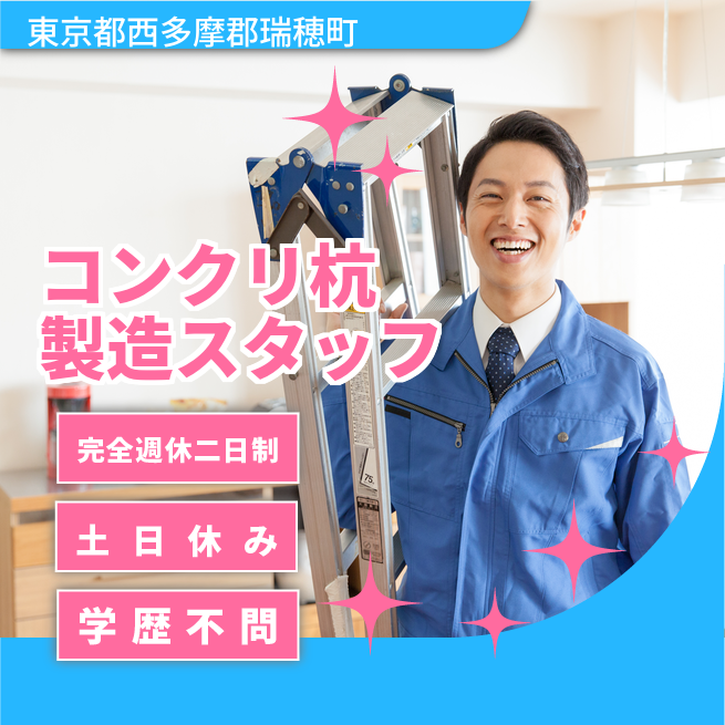 給与詳細 月収例 244,800円 日給例 12,240円 勤務地 東京都西多摩郡瑞穂町 仕事内容 コンクリートパイルの製造