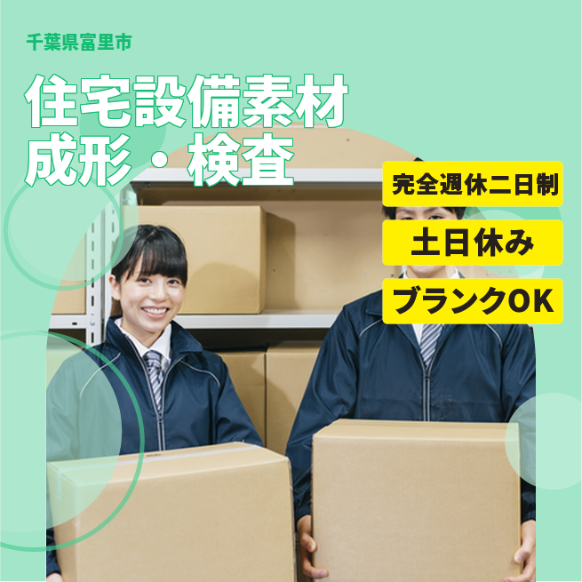 給与詳細 月収例 225,600円 日給例 11,280円 勤務地 千葉県富里市 仕事内容 バスタブ、キッチン、トイレに使用される素材製造:機械OP・検査・梱包