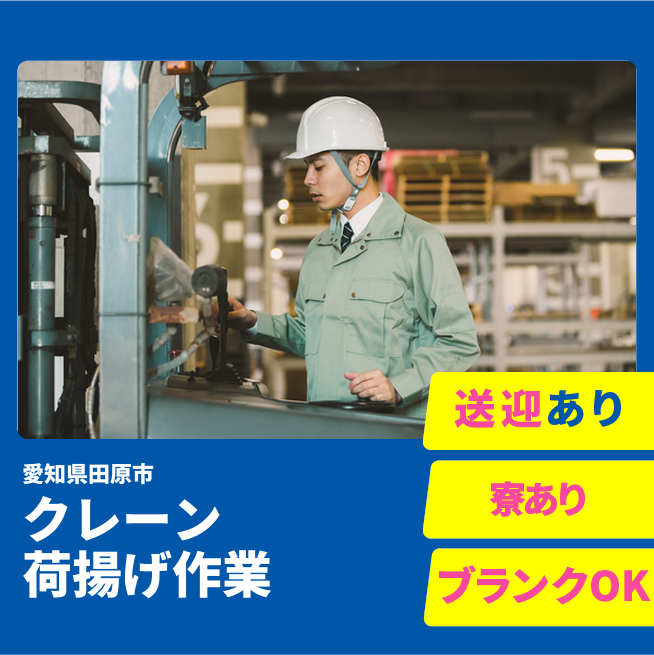 給与詳細 月収例 240,000円 日給例 12,000円 勤務地 愛知県田原市 仕事内容 クレーンで荷物の持ち上げ作業|玉掛け・クレーン免許必須(寮完備)