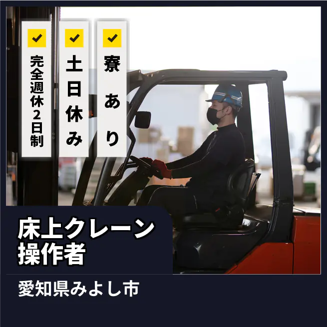 給与詳細 月収例 240,000円 日給例 12,000円 勤務地 愛知県みよし市 仕事内容 床上操作式クレーン・玉掛けを使った材料運搬(寮費無料)