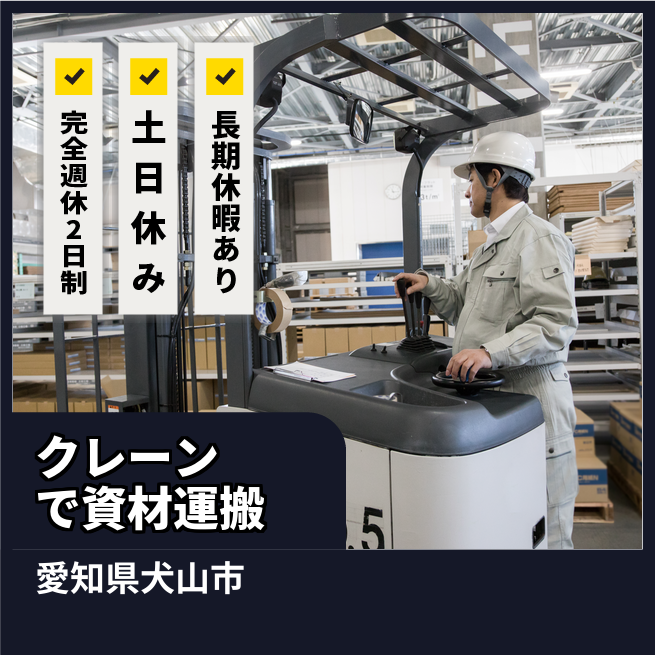 給与詳細 月収例 232,000円 日給例 11,600円 勤務地 愛知県犬山市 仕事内容 クレーンで材料の運搬作業|床上操作式クレーン資格必須(寮完備)
