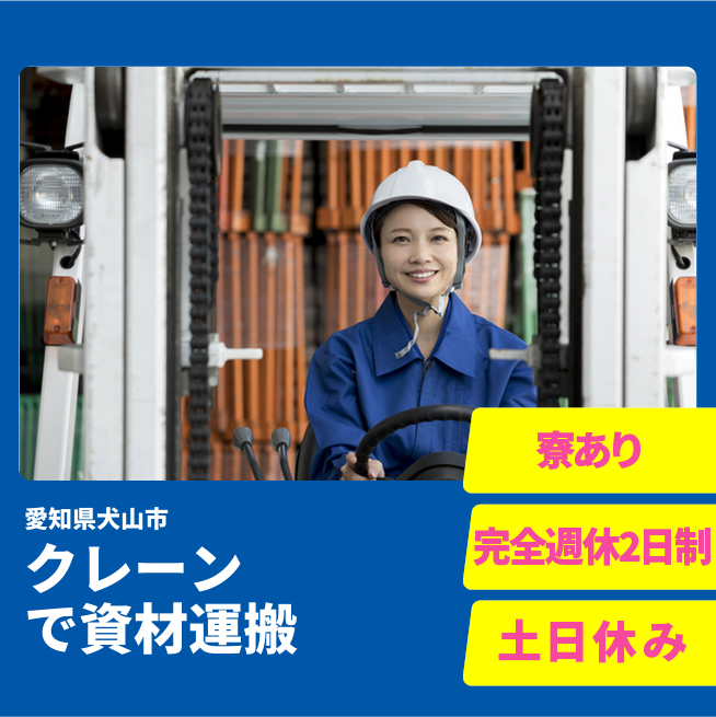 給与詳細 月収例 232,000円 日給例 11,600円 勤務地 愛知県犬山市 仕事内容 クレーンで材料の運搬作業|床上操作式クレーン資格必須(寮完備)
