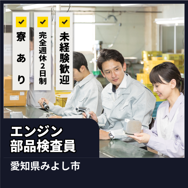 給与詳細 月収例 209,600円 日給例 10,480円 勤務地 愛知県みよし市 仕事内容 車のエンジン部品の検査作業(寮費無料)
