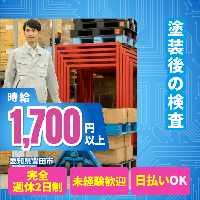 給与詳細 月収例 272,000円 時給例 1,700円 勤務地 愛知県豊田市 仕事内容 製品に異物や塗り残しがないかチェックするお仕事(寮費無料)