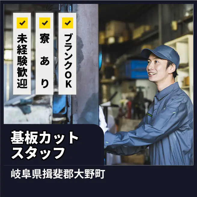 ※各規定あり 交通費 支給あり 応募の流れ 本ページ内<応募する>ボタンより、必要項目をご入力の上、ご応募ください。 勤務地 【勤務地】岐阜県揖斐郡大野町- 勤務時間 【勤務地】◆2交代シフト制
