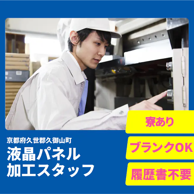 給与詳細 月収例 216,000円 日給例 10,800円 勤務地 京都府久世郡久御山町 仕事内容 電子部品の機械操作や目視検査(寮費半額補助)