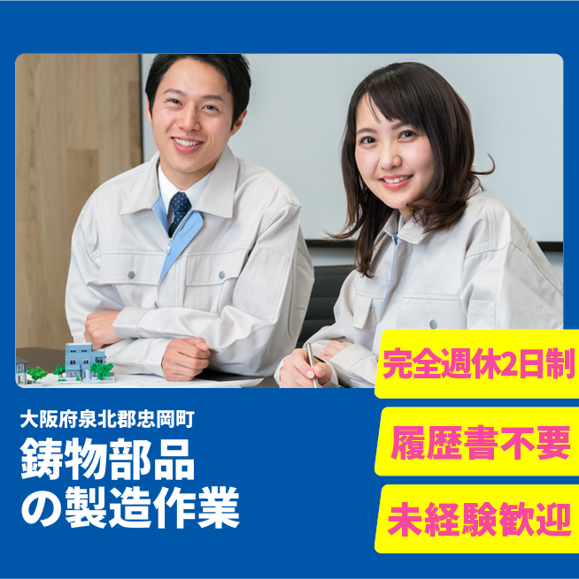 給与詳細 月収例 196,800円 時給例 1,230円 勤務地 大阪府泉北郡忠岡町 仕事内容 \未経験から始められる、モノづくりの現場でのお仕事!/