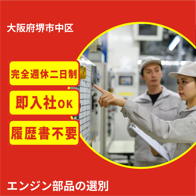 時給例:1350円 交通費 支給あり 応募の流れ 本ページ内<応募する>ボタンより、必要項目をご入力の上、ご応募ください。 勤務地 【勤務地】大阪府堺市中区小阪西町 勤務時間 【勤務地】8:00~17:00