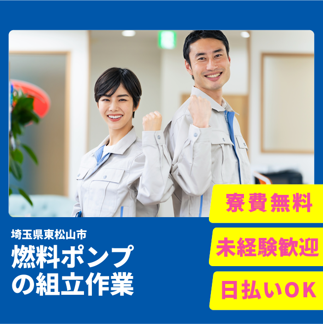 給与詳細 月収例 261,247円 日給例 11,600円 勤務地 埼玉県東松山市 仕事内容 ■自動車部品の組立と付帯業務