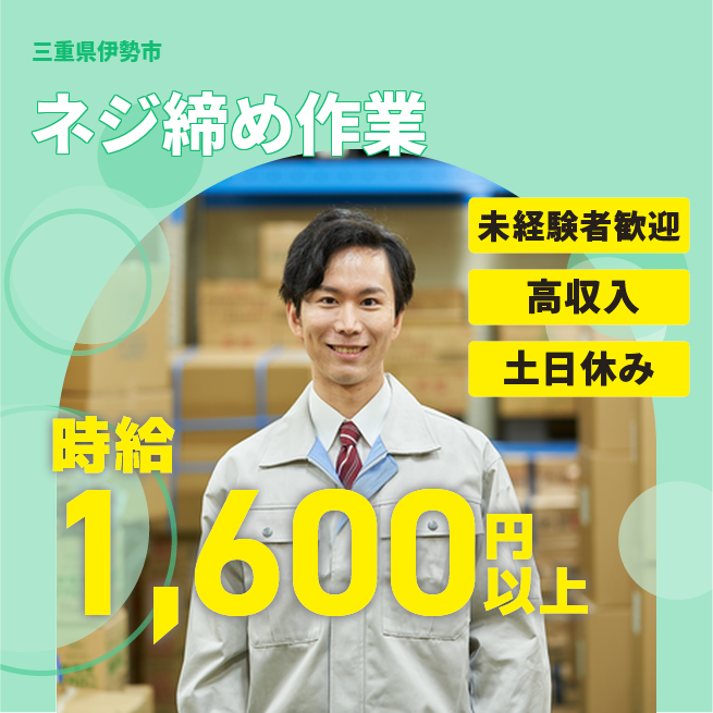 ※規定あり 公開日 2025年10月01日 伊勢市下野町/ねじ締めや梱包などの軽作業/土日休み/日勤勤務/20代、30代、40代の男女活躍中