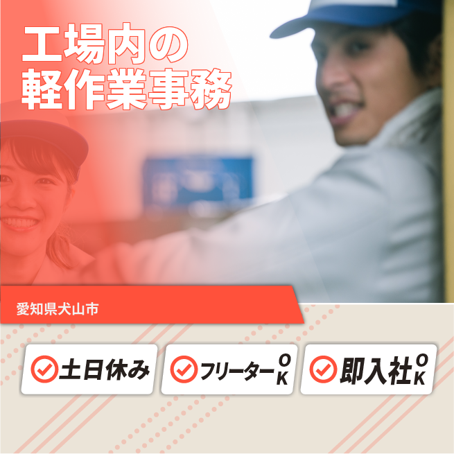 愛知県犬山市の大手機械メーカー工場で、シール貼りや部品仕分けなどの軽作業と、書類確認・データ入力等の事務補助を行います。