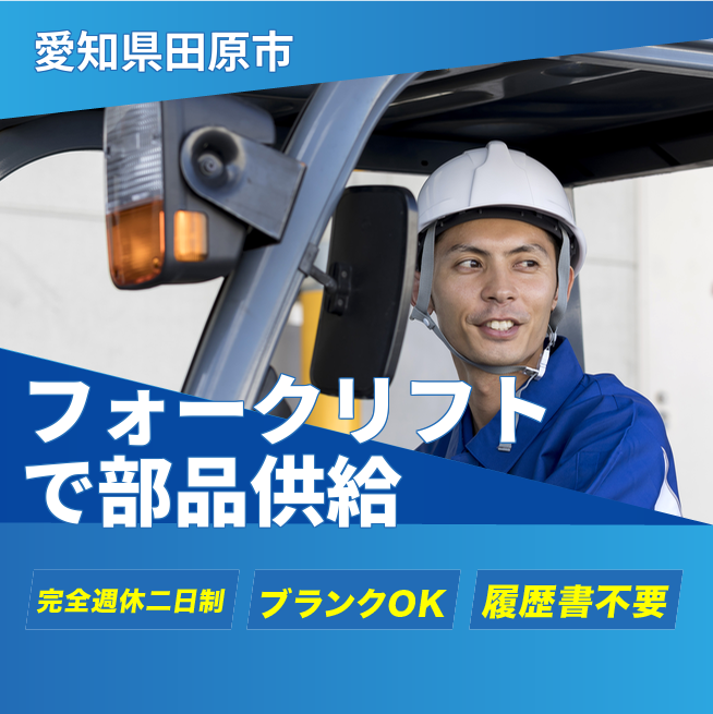 工場倉庫内でフォークリフトを使用し、設備生産(製造ライン)に必要な部品を集める作業。部品はケーブルから精密機器まで様々!部品はリストを元に集めていただきます。