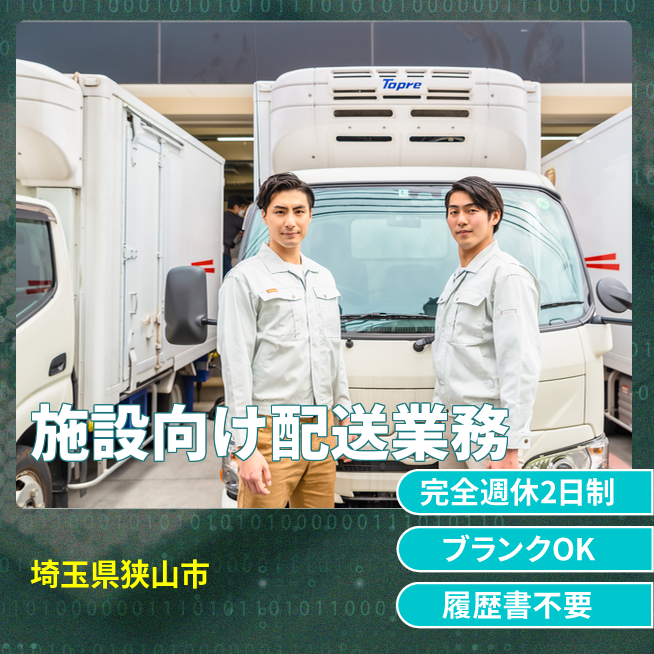 高齢者施設や病院へ食材を届ける業務用食品商社のルート配送ドライバー。狭山市エリアでピッキングから納品、翌日準備まで担当します。