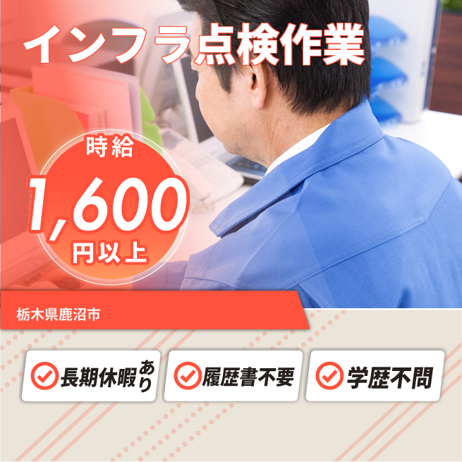 給与詳細 月収例 268,800円 時給例 1,600円 勤務地 栃木県鹿沼市 仕事内容 <栃木県鹿沼市エリア>