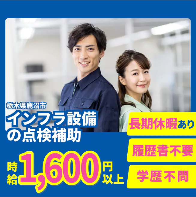 給与詳細 月収例 268,800円 時給例 1,600円 勤務地 栃木県鹿沼市 仕事内容 【概要】