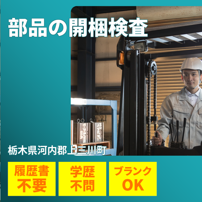 大手自動車メーカーで開梱・検査・梱包と、完成品のフォーク出荷運搬を担当します。