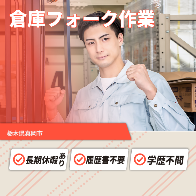 時給例:1300円 応募の流れ 本ページ内<応募する>ボタンより、必要項目をご入力の上、ご応募ください。 勤務地 【勤務地】栃木県真岡市- 勤務時間 【勤務地】8:00~17:00