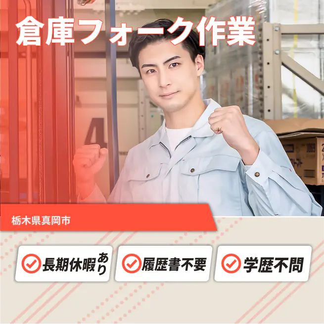 フォークリフトでの倉庫内取り回し・出荷・入荷受入れ・伝票処理。日勤・残業少なめ。
