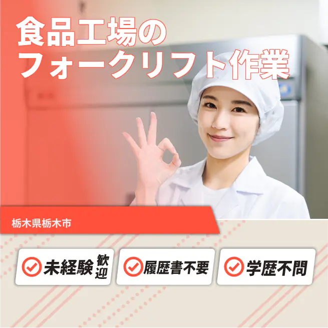食品工場でフォークリフトを使った資材準備・出庫。長期安定・有資格者歓迎。
