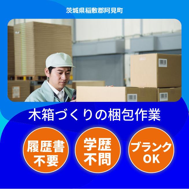 広い倉庫で部品の木箱詰めや梱包、簡単な箱作りを行う日勤の軽作業です。