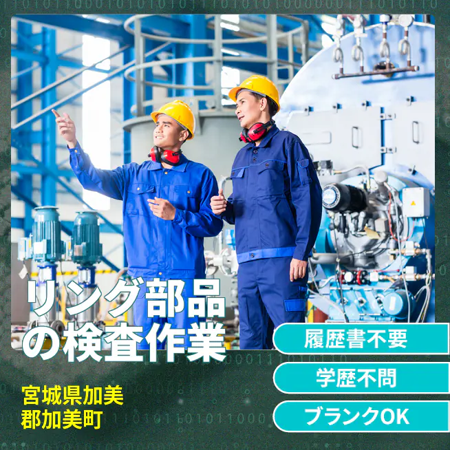 給与詳細 月収例 201,600円 時給例 1,200円 勤務地 宮城県加美郡加美町 仕事内容 リング部品(手のひらサイズ)のマシンセット・目視検査