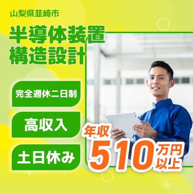 時給例:2687.5円 応募の流れ 本ページ内<応募する>ボタンより、必要項目をご入力の上、ご応募ください。 勤務地 【勤務地】山梨県韮崎市- 勤務時間 【勤務地】8:30-17:15