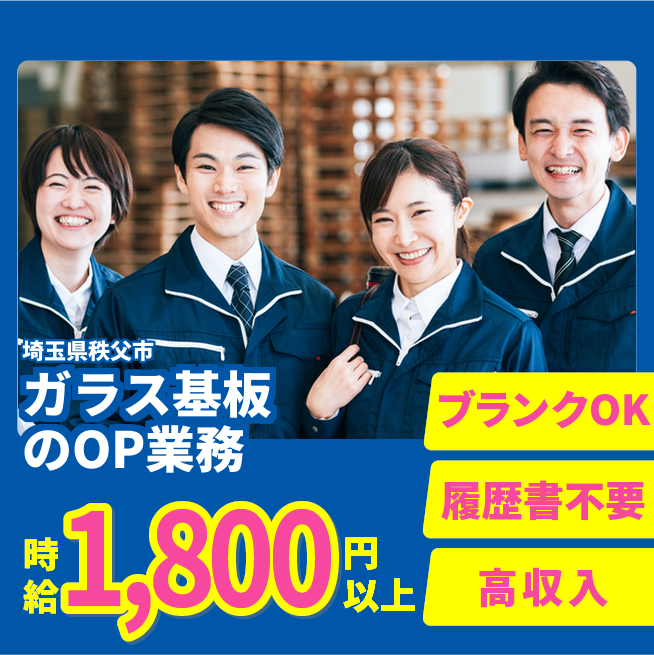 給与詳細 月収例 280,000円 時給例 1,800円 勤務地 埼玉県秩父市 仕事内容 半導体(ガラス基板)製造機械オペレーター業務