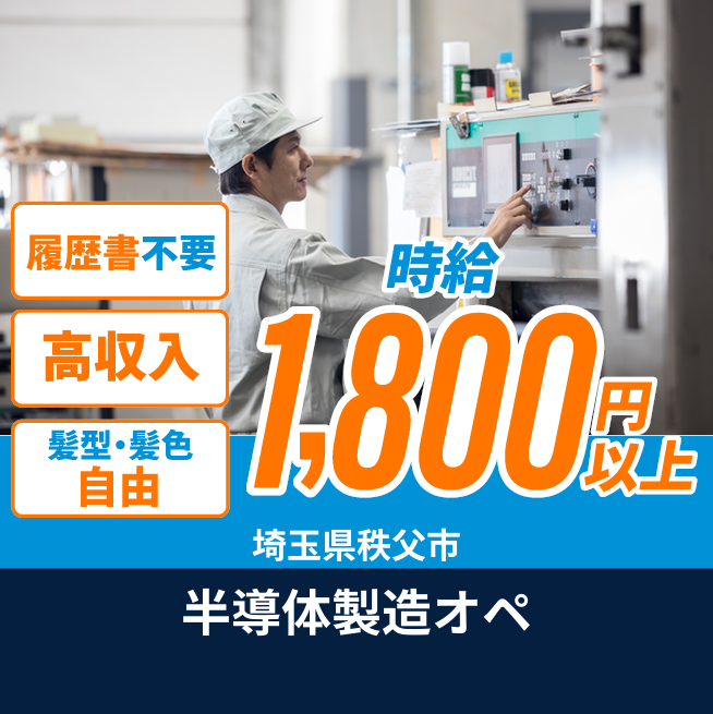 給与詳細 月収例 280,000円 時給例 1,800円 勤務地 埼玉県秩父市 仕事内容 【業務内容】半導体製造機械のオペレーター業務