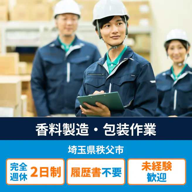 給与詳細 月収例 232,050円 時給例 1,190円 勤務地 埼玉県秩父市 仕事内容 【業務内容】香料の製造および関連作業を行います