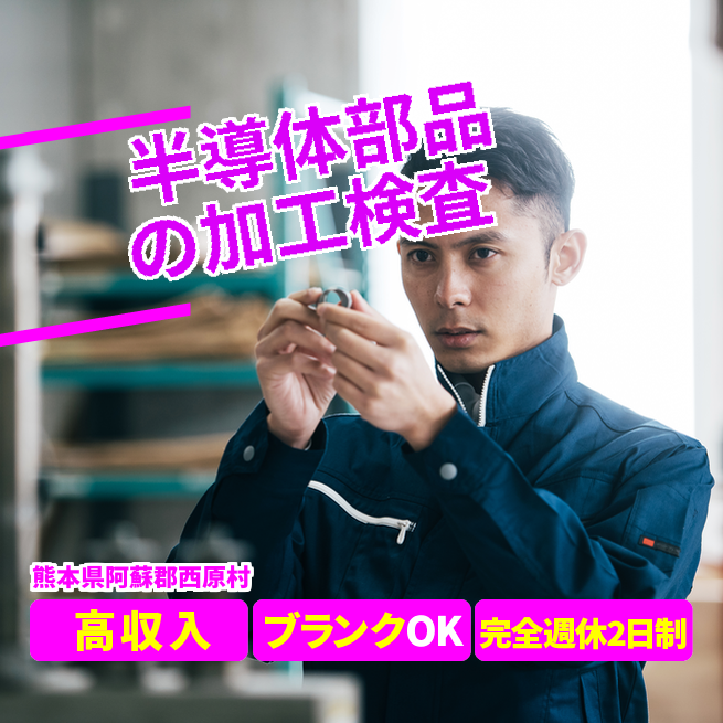 給与詳細 月収例 250,000円 日給例 12,500円 勤務地 熊本県阿蘇郡西原村 仕事内容 半導体製造の部品製造に伴う装置オペレーション及び検査。