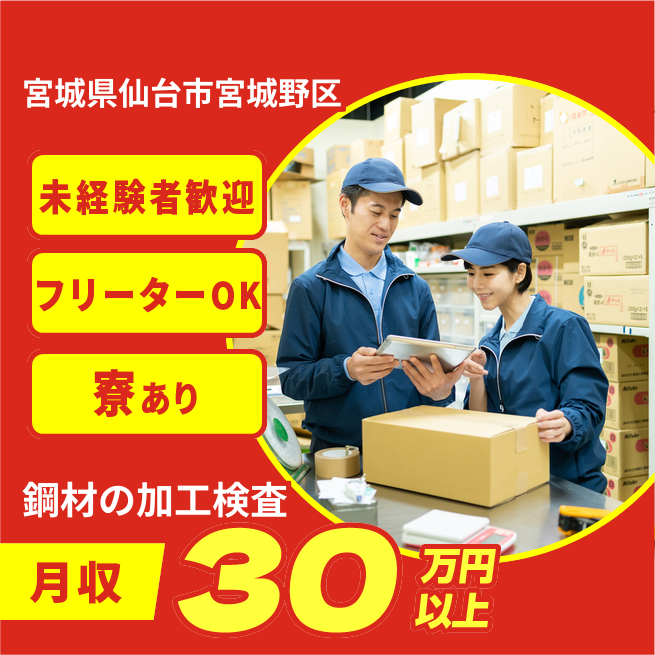 給与詳細 月収例 312,000円 日給例 10,400円 勤務地 宮城県仙台市宮城野区 仕事内容 小型グラインダーで加工作業、完成品の目視検査、結束、シール貼り等
