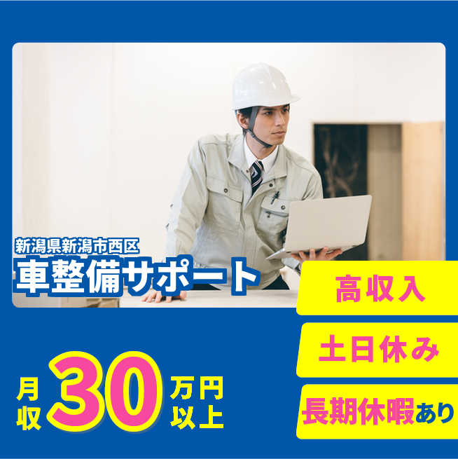 給与詳細 月収例 295,000円 時給例 1,843円 勤務地 新潟県新潟市西区 仕事内容 ウィルオブ・ワークの正社員として取引先の大手自動車整備工場にて勤務いただきます。