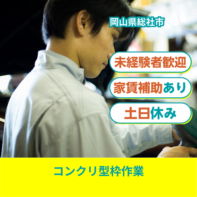 給与詳細 月収例 195,000円 時給例 1,218円 勤務地 岡山県総社市 仕事内容 ウィルオブ・ワークの正社員として取引先の2次コンクリート製品の製造工場で勤務いただきます。