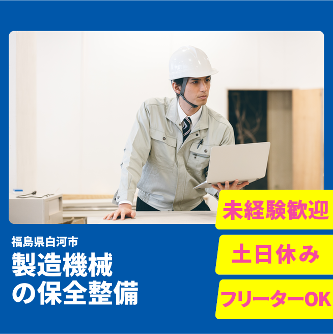 給与詳細 月収例 200,000円 日給例 10,000円 勤務地 福島県白河市 仕事内容 ウィルオブ・ワークの正社員として自動車部品製造機械等の保全業務を行う取引先で勤務いただきます。