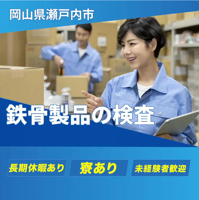 20~21.6万円 交通費 支給あり 応募の流れ 本ページ内<応募する>ボタンより、必要項目をご入力の上、ご応募ください。 勤務地 【勤務地】岡山県瀬戸内市- 勤務時間 【勤務地】日勤