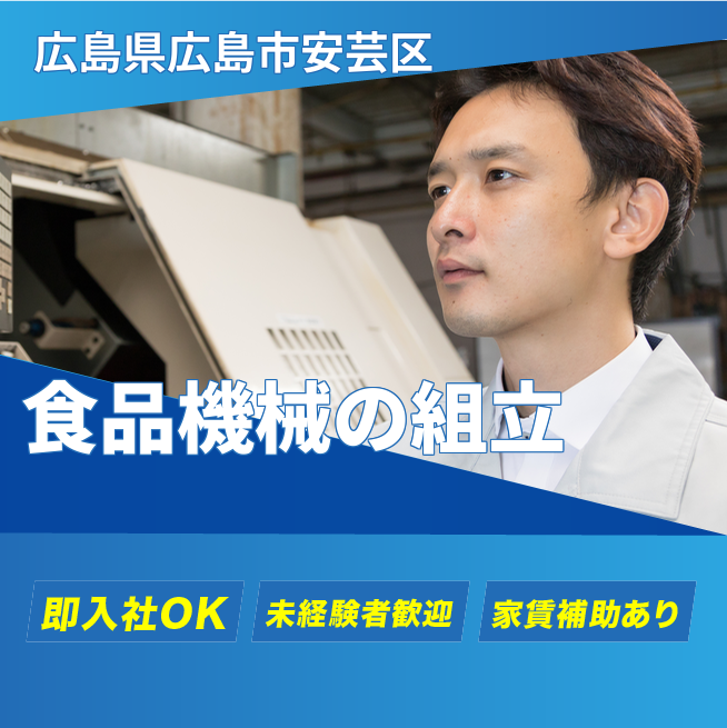 給与詳細 月収例 205,000円 日給例 10,250円 勤務地 広島県広島市安芸区 仕事内容 ウィルオブ・ワークの正社員として取引先の食品機械装置製造工場で勤務いただきます。