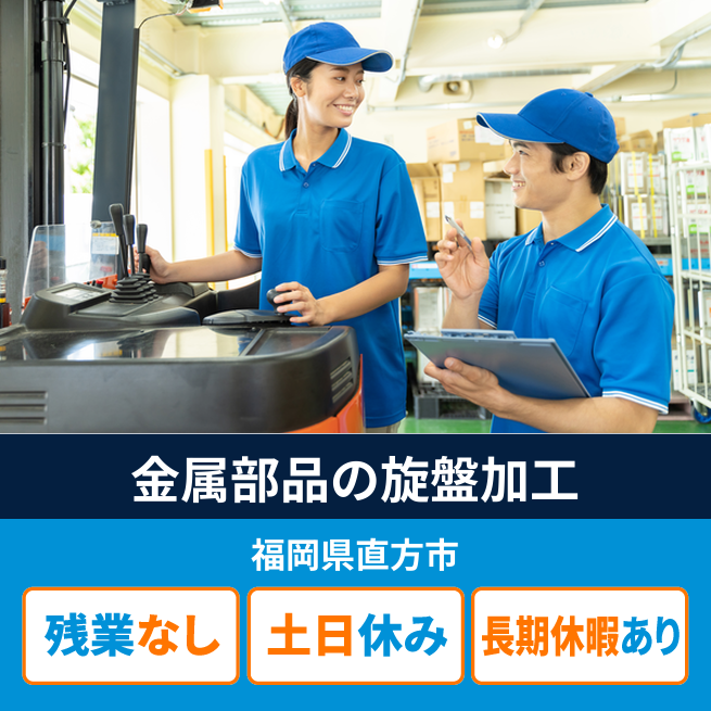 給与詳細 月収例 210,000円 日給例 10,500円 勤務地 福岡県直方市 仕事内容 ウィルオブ・ワークの正社員として取引先の金属部品加工工場で勤務いただきます。