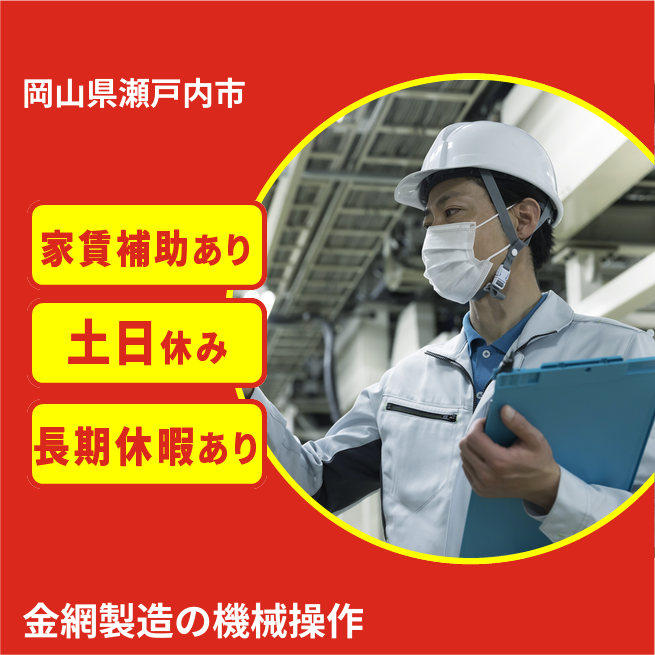 21~24.5万円 交通費 支給あり 応募の流れ 本ページ内<応募する>ボタンより、必要項目をご入力の上、ご応募ください。 勤務地 【勤務地】岡山県瀬戸内市- 勤務時間 【勤務地】日勤