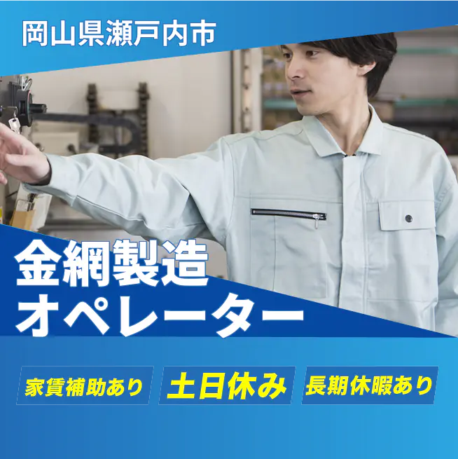 21~24.5万円 交通費 支給あり 応募の流れ 本ページ内<応募する>ボタンより、必要項目をご入力の上、ご応募ください。 勤務地 【勤務地】岡山県瀬戸内市- 勤務時間 【勤務地】日勤