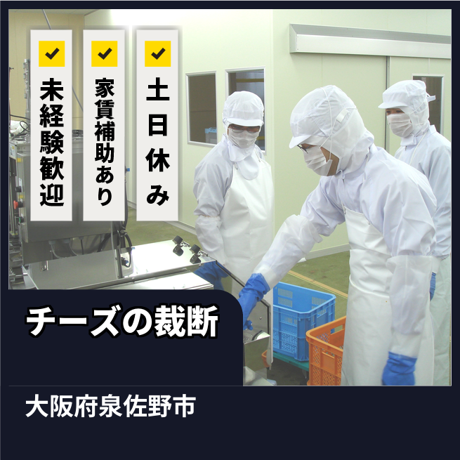 給与詳細 月収例 210,000円 日給例 10,500円 勤務地 大阪府泉佐野市 仕事内容 ウィルオブ・ワークの正社員として取引先のチーズ加工工場で勤務いただきます。