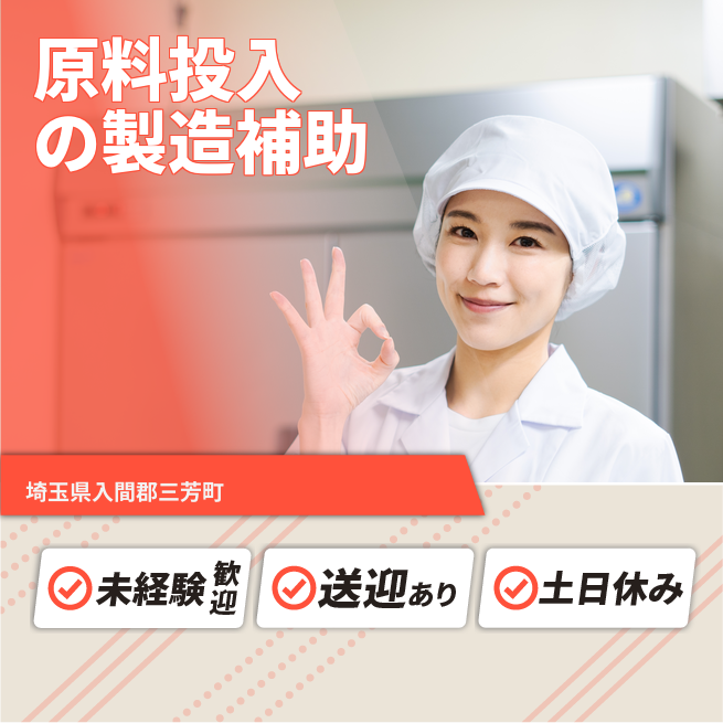 給与詳細 月収例 210,000円 日給例 10,500円 勤務地 埼玉県入間郡三芳町 仕事内容 ウィルオブ・ワークの正社員として食品製造メーカーの取引先で勤務いただきます。