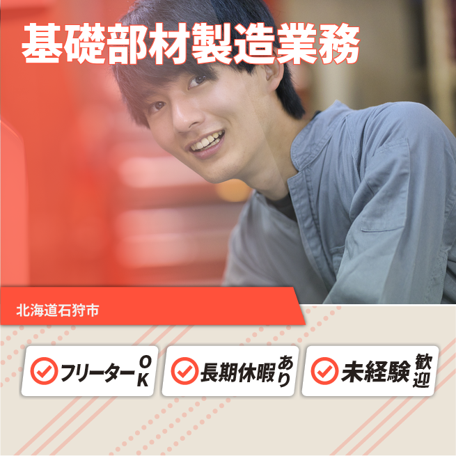 25.4~27.4万円 交通費 支給あり 応募の流れ 本ページ内<応募する>ボタンより、必要項目をご入力の上、ご応募ください。 勤務地 【勤務地】北海道石狩市- 勤務時間 【勤務地】日勤