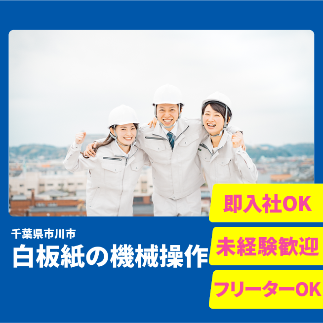 給与詳細 月収例 215,000円 日給例 10,750円 勤務地 千葉県市川市 仕事内容 ウィルオブ・ワークの正社員として、パッケージ・商業印刷物・出版表紙などに使用する白板紙(しろいたがみ)の製造工場で勤務いただきます。