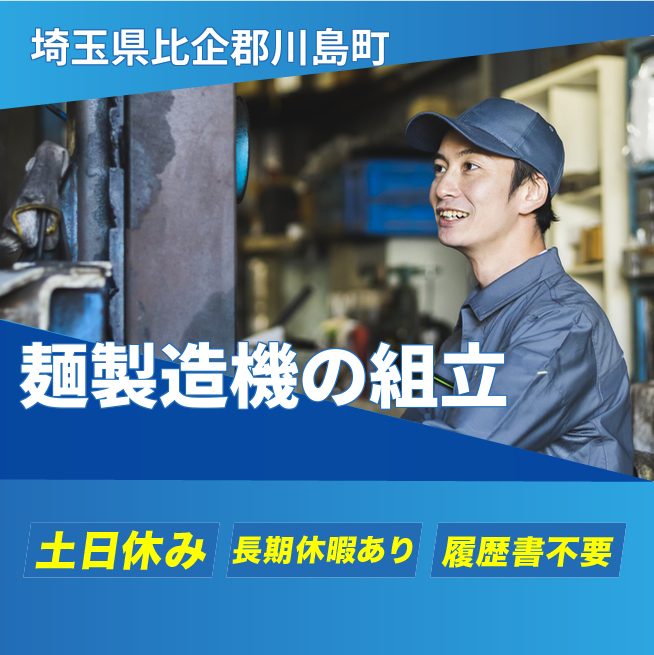 26.9~28.7万円 交通費 支給あり 応募の流れ 本ページ内<応募する>ボタンより、必要項目をご入力の上、ご応募ください。 勤務地 【勤務地】埼玉県比企郡川島町- 勤務時間 【勤務地】日勤