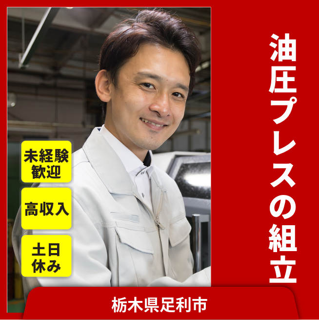 給与詳細 月収例 225,000円 日給例 11,250円 勤務地 栃木県足利市 仕事内容 ウィルオブ・ワークの正社員として取引先の油圧プレス機械の製造工場で勤務いただきます。