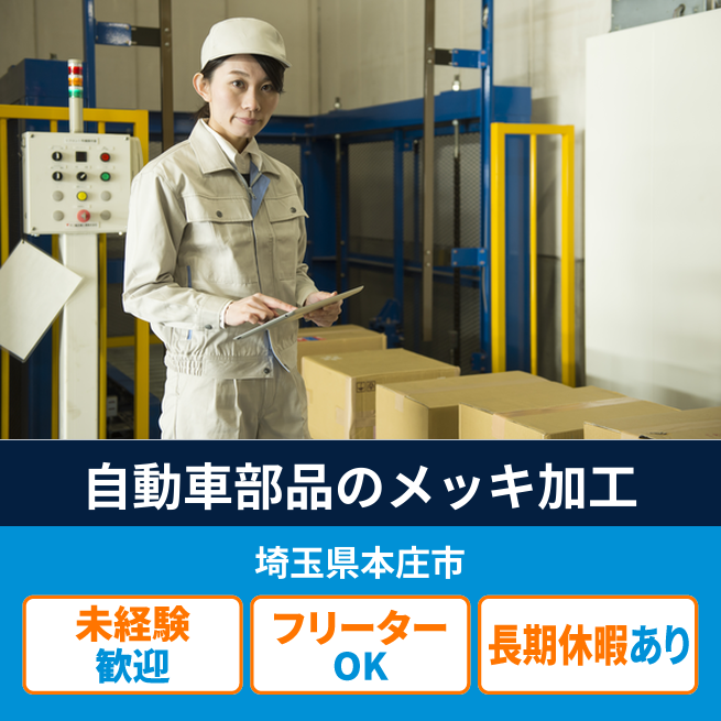 給与詳細 月収例 235,000円 日給例 11,750円 勤務地 埼玉県本庄市 仕事内容 ウィルオブ・ワークの正社員としての取引先の電気自動車、ハイブリット自動車向けメッキ加工工場にて勤務いただきます。