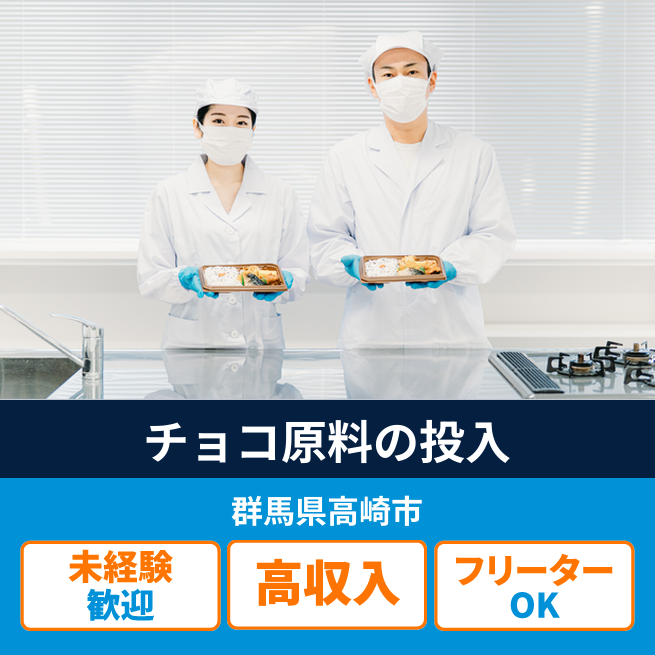 給与詳細 月収例 240,000円 日給例 12,000円 勤務地 群馬県高崎市 仕事内容 ウィルオブ・ワークの正社員としてチョコレート製造工場で、製造補助のお仕事をお任せします。