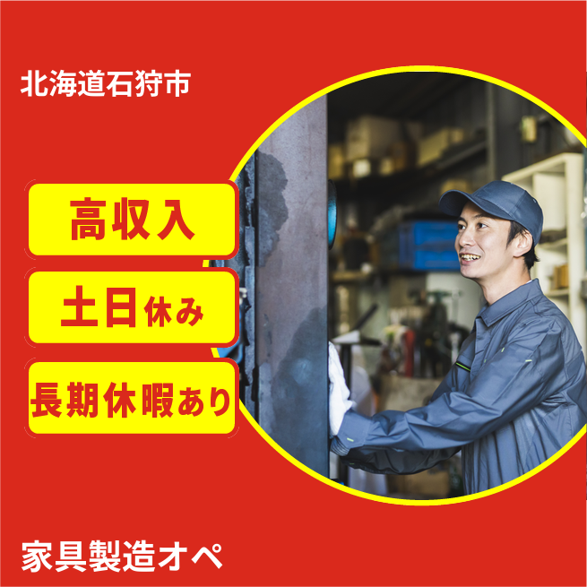 給与詳細 月収例 240,000円 日給例 12,000円 勤務地 北海道石狩市 仕事内容 ウィルオブ・ワークの正社員として家具製造工場の取引先で勤務いただきます。